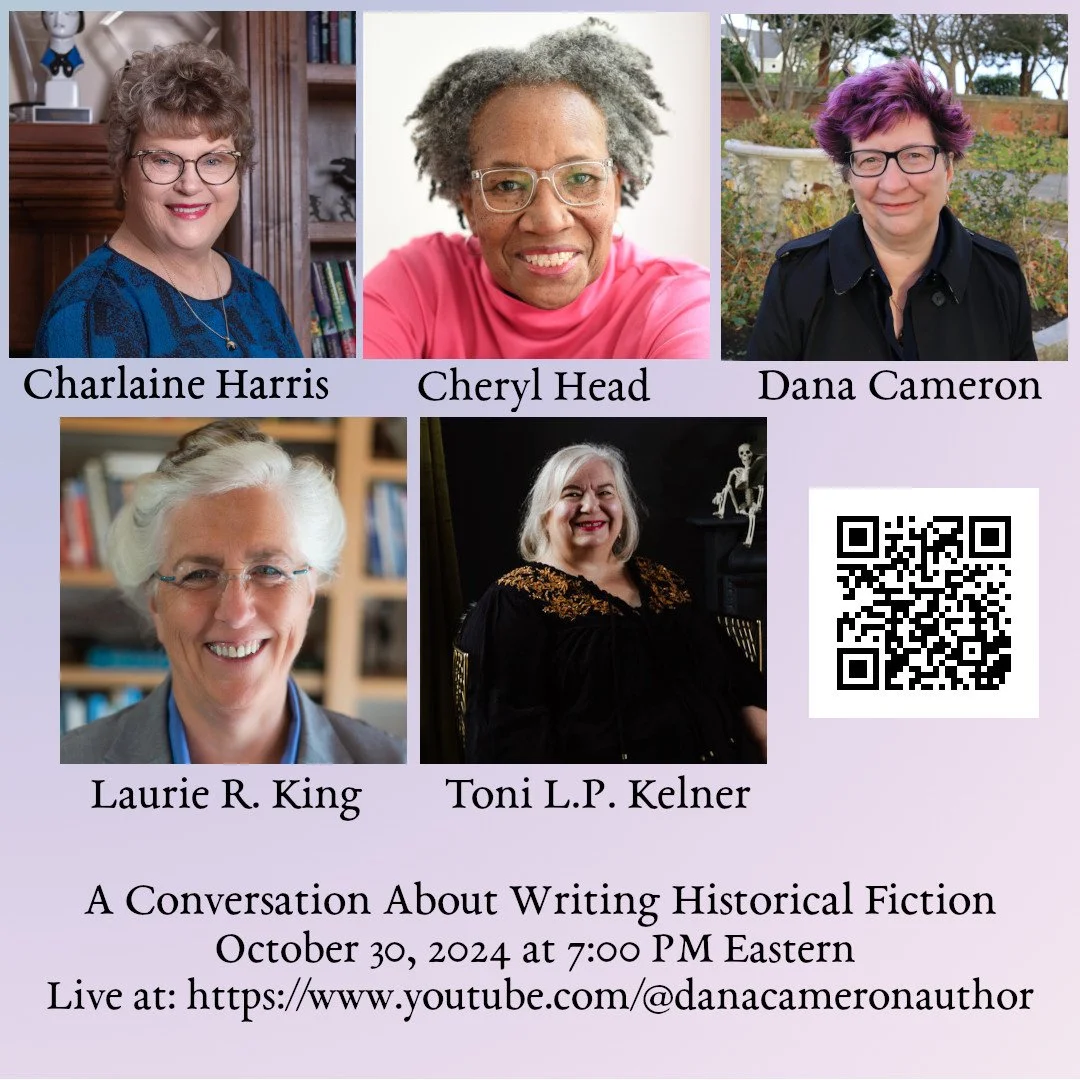 As part of the launch of Dana Cameron’s Anna Hoyt: A Novel of Colonial Crime, join her and best-selling and award-winning authors Charlaine Harris, Cheryl Head, Laurie R. King, and Toni L.P. Kelner in an online discussion about writing historical fiction. Whether you read (or write) crime or speculative fiction, the temporal setting will have an impact on your plot and characters, so bring your questions about how to put the history into your storytelling and share them with us in the chat.